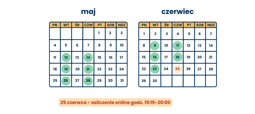 - zajęcia odbywają się z reguły co tydzień we wtorki i czwartki w godzinach 16:00 - 20:00 (raz 20:45)